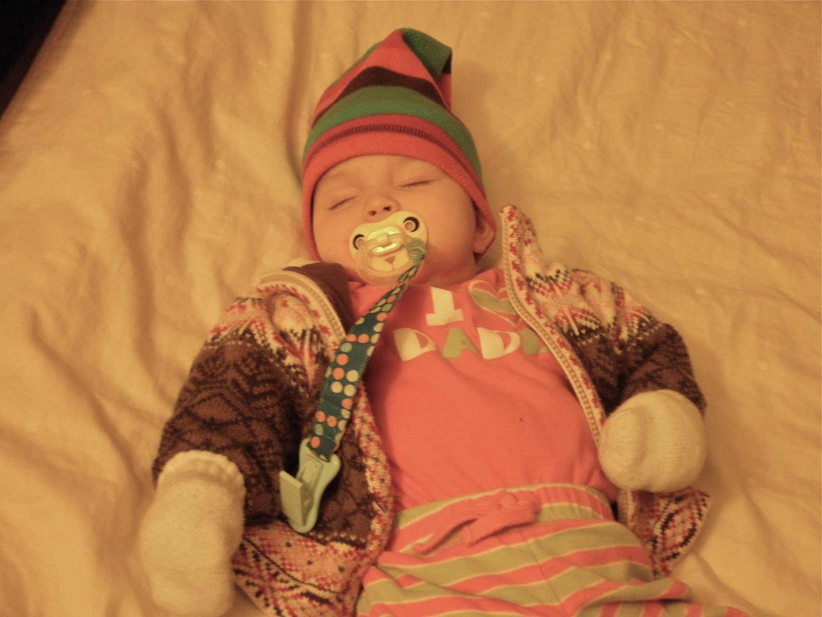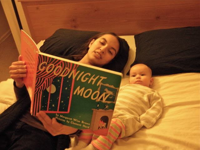 So when I'm finished teaching, I drive home (or to my parents' house), sometimes eat a quick dinner depending on how tired Harmony is when I arrive, and then get Harmony ready for bed. We change her diaper, put on her pajamas, turn on her night light, and prepare the bed. We always read the book "Goodnight Moon" together. She nurses one last time, and then I turn out the lights and sing her three songs: a blessing, a prayer, and her favorite song.