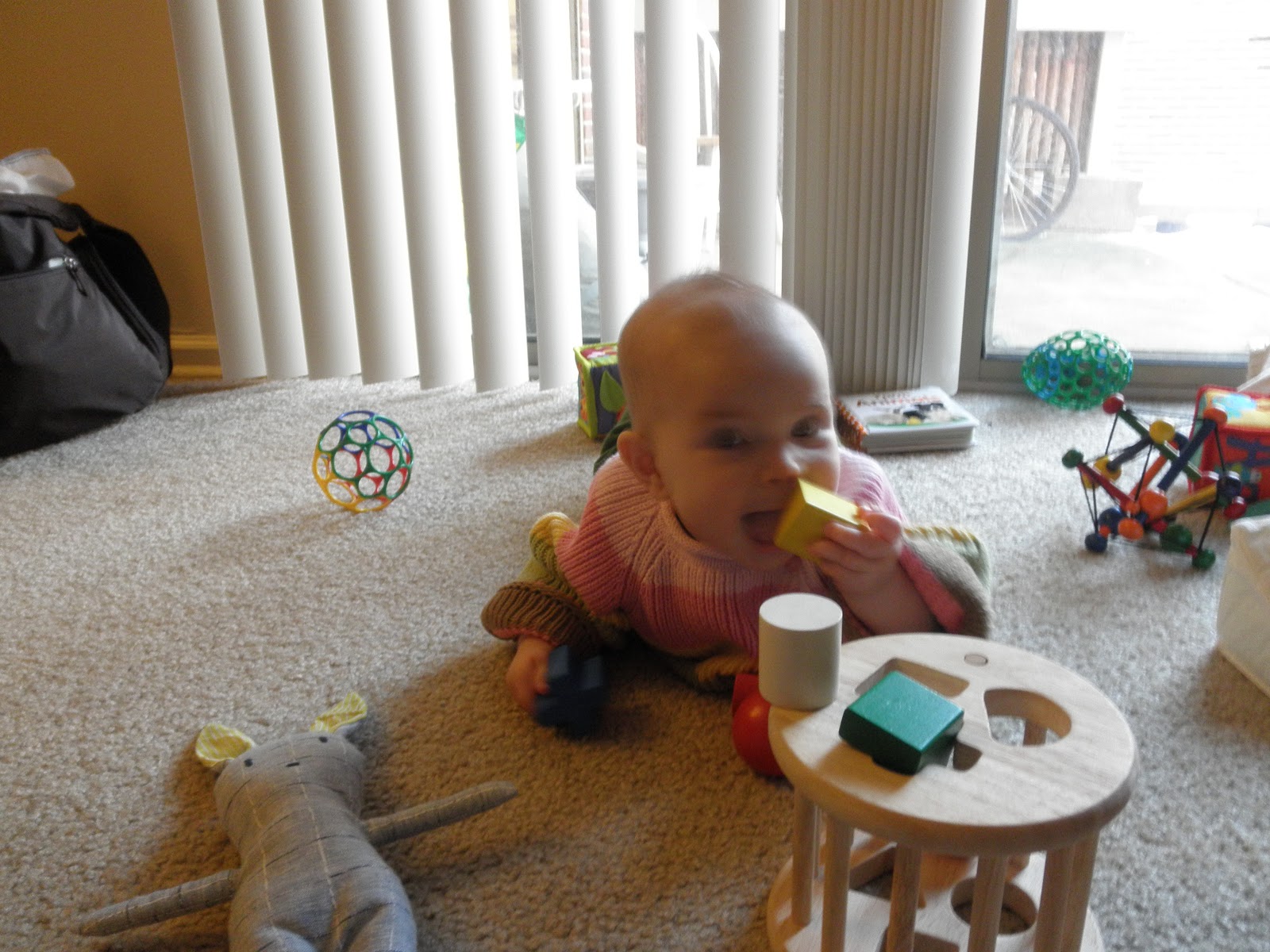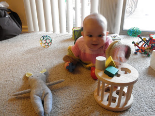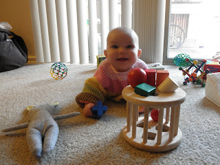 Harmony's favorite toys right now are her wooden shapes that she can hold and knock together, a red wooden ball, and spoons/measuring cups. She's just getting to the stage where she likes knocking over towers that we build for her.