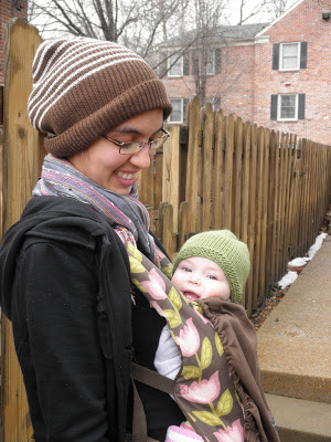 Harmony rides along either in her stroller or the Ergo baby carrier; I'm a fan of the Ergo in cold weather, because we keep each other warm ; ) This carrier was a resale store deal that I found for almost half the normal price! She loves being up near the action as I do house-work or cook, while riding on my back or my front, and will happily take naps in it too. The Ergo is my life-saver!