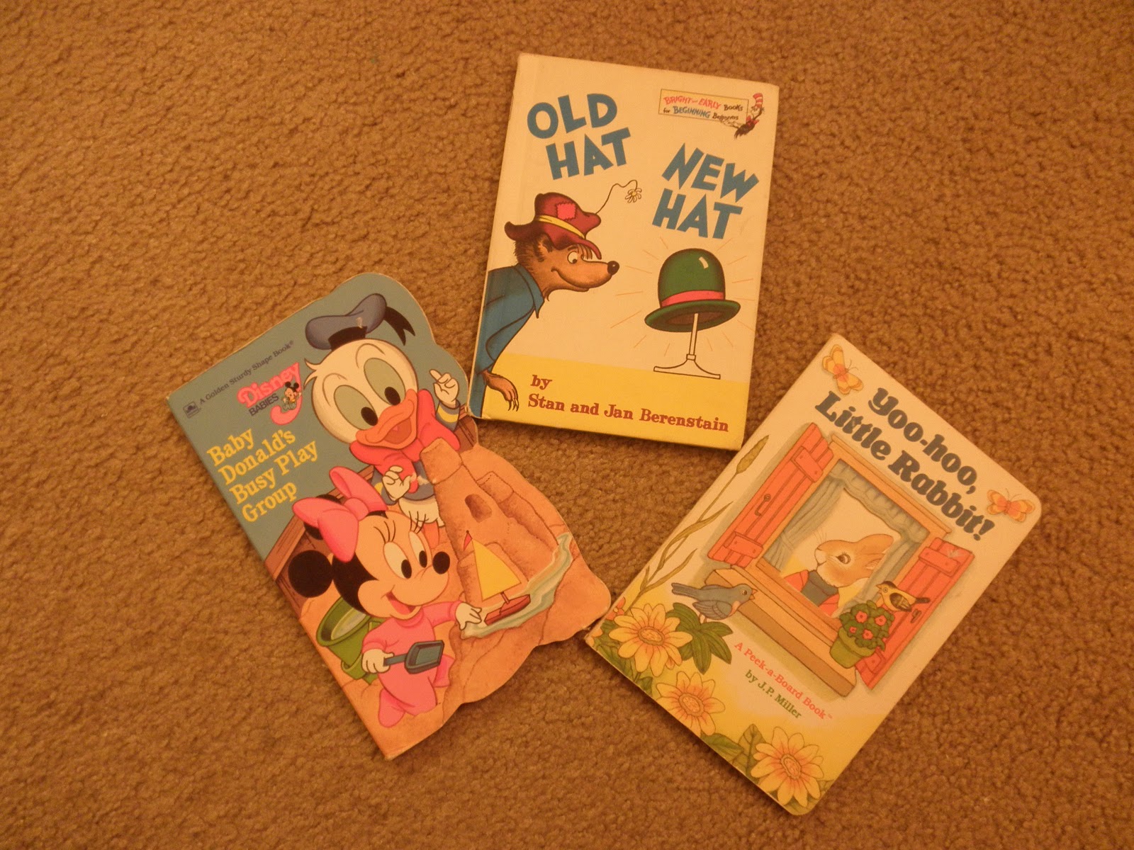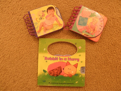 Books for Harmony to play with and for us to read to her. The colors and shapes books are heavy plastic, perfect for her to turn the pages; the "Rabbit in a Hurry" book has a cardboard bunny which pops up when you pull the tab on the side. Harmony is all about the interactive books right now.