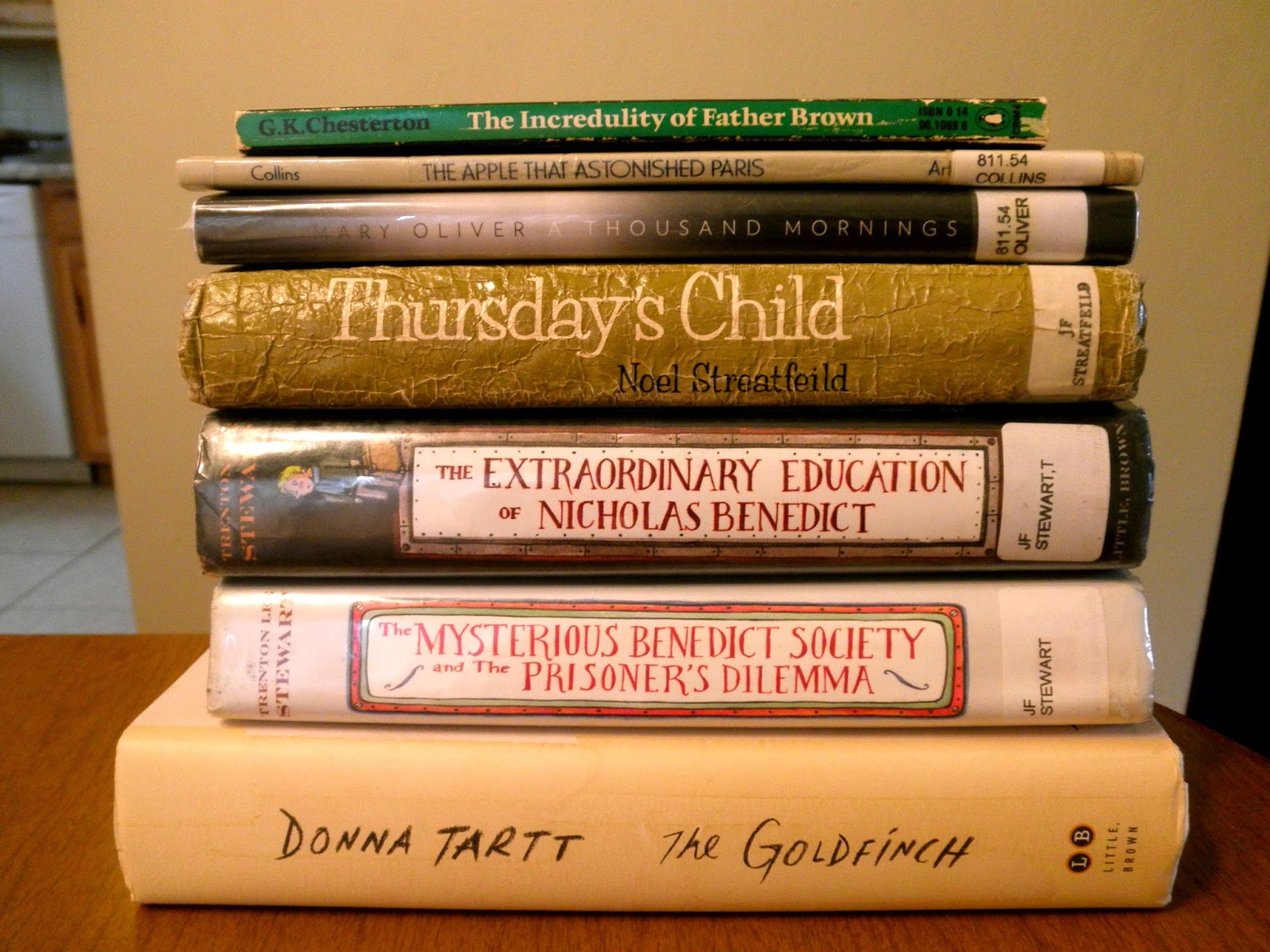 ~ The Goldfinch by Donna Tartt. THANK YOU to Alice N. for dropping her lovely hardback copy off at my home so I didn't have to be 35th in line to read it at the library!